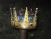 Tiercé au pairle patté d'or renversé, qui est la croix de Saint-Éric, à dextre d'azur, à trois couronnes d'or (de Suède moderne) à senestre d'azur à trois barres ondées d'argent, au lion couronné d'or, brochant sur le tout (de Suède ancien); en pointe de gueules, au griffon d'or, becqué, langué et armé d'azur, accompagné de quatre roses d'argent (Östergötland) sur-le-tout écartelé : 1, de gueules, à la feuille d'ortie d'argent (de Holstein) ; 2, d'or, à deux lions léopardés d'azur, armés et lampassés de gueules (de Schleswig) ; 3, de gueules, au cygne d'argent, becqué, membré et colleté d'une couronne d'or (de Stormarn) ; 4, de gueules, au cavalier armé d'argent (de Dithmarse) ; sur-le-tout-du-tout, écartelé d'or à deux fasces de gueules (de Oldenbourg) et d'azur, à la croix pattée, au pied fiché d'or (de Delmenhorst) et surmonté d'une couronne royale[3].
