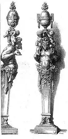 - Grande torchère de style néo-Louis XIV, genre Bérain, Les Quatre Éléments, exécutée par la maison De Marnyhac et présentée à l’Exposition universelle de 1878, plâtre au musée des beaux-arts de Troyes, exemplaires en bronze doré encadrant l’entrée du Westin-Hôtel Paris-Vendôme