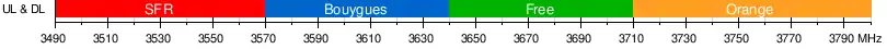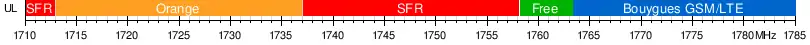 À la suite de la décision no 2018-1306[17] de l'Arcep, les opérateurs mobiles, Orange, SFR, Bouygues Telecom et Free Mobile doivent se contenter de 14,8 MHz. Sur cette bande, la répartition est identique entre les quatre opérateurs.