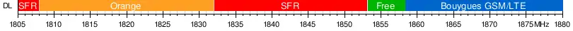 Bande LTE no 3 FDD[3],[4]. Cette bande de fréquence a une utilisation mixte 2G (GSM) et 4G (LTE)[8]. La technologie présente sur la bande varie localement selon les zones et il peut également y avoir les 2 technologies à la fois dessus.