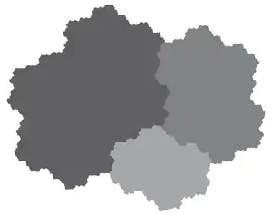 - Peut être recouverte par trois copies d'elle-même, réduites de facteurs : , et avec solution de : .