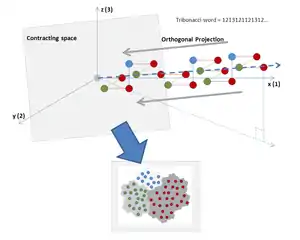 3) Projeter alors ces points sur l'espace contractant (plan orthogonal à la direction générale de propagation de ces points, aucun des points projetés ne s'échappe à l'infini). La fractale de Rauzy est la clôture de cet ensemble.