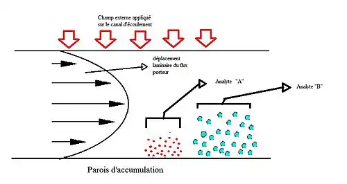 - Paroi d’accumulation : paroi où les analytes se retrouvent après avoir interagi avec un champ externe ou un écoulement transversal