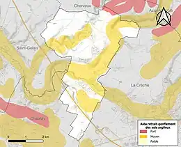 Les mouvements de terrains susceptibles de se produire sur la commune sont des tassements différentiels[18]. Le retrait-gonflement des sols argileux est susceptible d'engendrer des dommages importants aux bâtiments en cas d’alternance de périodes de sécheresse et de pluie[19]. 39,6 % de la superficie communale est en aléa moyen ou fort (54,9 % au niveau départemental et 48,5 % au niveau national)[Carte 2]. Depuis le , en application de la loi ELAN, différentes contraintes s'imposent aux vendeurs, maîtres d'ouvrages ou constructeurs de biens situés dans une zone classée en aléa moyen ou fort[Note 3],[20].