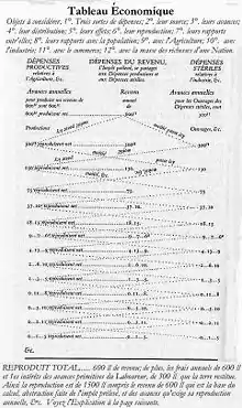 Il est le premier à imaginer l'économie à un niveau macroéconomique. Les agents économiques ne sont pas considérés comme une somme d'agents individuels, comme dans la théorie classique (Adam Smith, David Ricardo, John Stuart Mill), mais représentent des classes sociales[12]. À ce titre, c'est-à-dire en considérant l'économie dans sa globalité et à l'encontre du postulat classique d'individualisme méthodologique, il est précurseur de la pensée de Karl Marx et de Keynes, qui reprendront tous deux le modèle du tableau, en représentant l'économie sous forme de circuit.