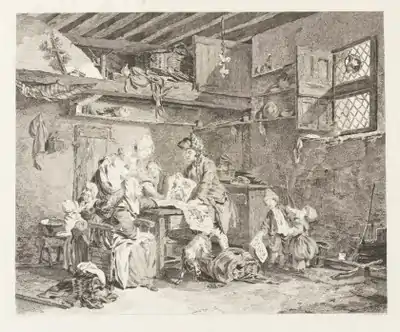 - Musée du Louvre, Paris, La création d'Eve, lavis de sépia[25], Le négociant ambulant, d'après Sigmund Freudenberger[48], La paix du ménage, d'après Jean-Baptiste Greuze[19].