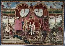 Le Retour de la chasseLe même jour, ils eurent le plaisir d'une chasse, dont ils avaient été priés par M. de la Rablière. Ils allèrent jusqu'à la porte de la ville dans les carrosses qu'il leur avait envoyés, puis ils montèrent à cheval. Il y avait aussi quantité de dames à cheval, fort parées et vêtues en amazones, et plus de 20.000 personnes. Les chiens prirent beaucoup de gibier, et comme la populace en prit encore davantage, on fut contraint de faire cesser la chasse et d'obliger, du moins autant qu'on le pût, tout ce grand peuple à rentrer. MM. du Magistrat leur donnèrent la comédie dans l'hôtel de ville, après quoi ils passèrent dans une grande salle où il y avait un fort beau concert de voix et d'instrument qui dura une heure et demie. Ils allèrent de là dans une autre salle où était servie une collation magnifique de vingt couverts. (...)
