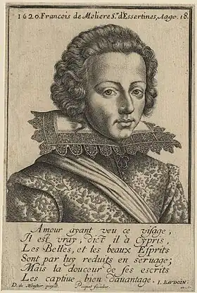 C'est vers cette même époque aussi, semble-t-il, que le jeune Molière se lie d'amitié avec Théophile de Viau, rentré d'exil au printemps 1620 et dont Jean-Pierre Camus n'hésite pas à citer les vers dans ses homélies[17]. Le 12 juin 1621, alors qu'il est « sur son partement pour aller trouver le roi en son armée au siège devant Saint-Jean-d'Angely, afin de lui rendre les honneurs qu'il doit à Sa Majesté », « François Hugues de Molières écuyer sieur d'Essertines » rédige un testament[18], dans lequel il institue sa mère, Anne Picardet, sa légatrice universelle et exécutrice testamentaire. Théophile de Viau et Tristan L'Hermite sont également présents à ce siège. Le second, âgé comme François de Molière d'une vingtaine d'années, sera, deux décennies plus tard, un familier de la famille Béjart et de l'Illustre théâtre.