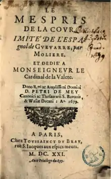 - Le Mespris de la cour. Imité de l'Espagnol de Guevarre, par Moliere. Et dedié à Monseigneur le Cardinal de la Valette, Paris, Toussainct du Bray, In-8 ̊, 1621, [16]-299-[1] p[39], consultable en ligne.