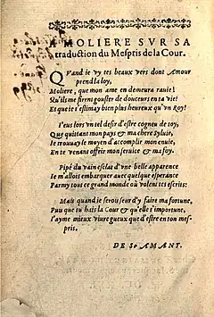 - Avec un sonnet liminaire de Saint-Amant intitulé : « À Molière sur sa traduction du Mespris de la cour », une épître dédicatoire de Molière d'Essertines adressée au cardinal de la Valette, un extrait du privilège royal du et le portrait de l'auteur par Daniel Du Monstier.
