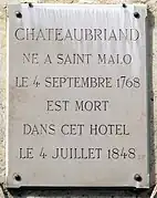 François-René, vicomte de Chateaubriand[N 1], né le à Saint-Malo et mort le à Paris, est un écrivain, mémorialiste et homme politique français. Il est considéré comme l'un des précurseurs et pionniers du romantisme français et l'un des grands noms de la littérature française.