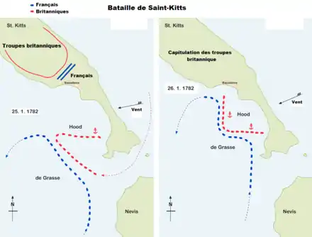 Cette déconvenue met Grasse dans une situation délicate, mais il dispose encore de la supériorité numérique. Il assure la protection des convois français et s'empare de l'île de Saint-Christophe avec le marquis de Bouillé, qui commande les troupes à terre. L'amiral Hood réussit à jeter l'ancre par surprise entre les deux, menaçant l'offensive française, puis s'échappe pendant la nuit du .
