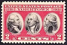Timbre américain de 1931 rendant hommage à Rochambeau, Washington et Grasse, à l'occasion du 150e anniversaire de la bataille de Yorktown.