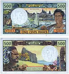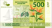 500 francs | 120 × 66 | Vert | Flore | Recto * Motif principal (centre, droite) : Fleurs d'Oiseau de paradis sur fond de motifs de bambou gravé * Motif secondaire (centre, avec les signatures) : Feuilles de taro * Bord inférieur : Motifs de bambou gravé (océan et soleil, pirogue, pins colonnaires, case) |