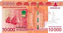 10 000 francs | 138 × 73 | Rouge | Architecture | Verso * Motif principal (centre) : Deux cases stylisées du Centre culturel Tjibaou * À gauche : Deux cases rondes traditionnelles sur fond de flèches faîtières |
