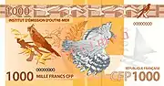1 000 francs | 126 × 66 | Brun orangé | Faune | Verso * Motif principal (centre) : Cagou devant une fronde de fougère * À gauche : Perruche cornue perchée sur une branche de niaouli |