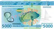 5 000 francs | 132 × 73 | Bleu | Faune marine | Recto * Motif principal (centre, droite) : Deux poissons-cochers devant une gorgone et sur fond d'ombres de poissons * Motif secondaire (centre, avec les signatures) : Coquille de nautile * Bord inférieur : Frise de poissons (poissons-papillons et poissons-perroquets) |