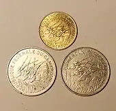 En même temps que ces précédentes émissions, les pièces en Franc CFA (CEMAC) circulent ensuite sur le territoire à partir de 1993[2].
