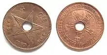 Les premières pièces furent frappées après 1909 sous le règne d'Albert. Les pièces d'une valeur inférieure à 50 centimes sont trouées. La première série de pièces courantes comprend des pièces de 1 et 2 centimes en bronze ; de 10, 20, 50 centimes et 1 franc en cupronickel. Une deuxième série comprend une pièce représentant Léopold III, d'une valeur de 5 francs, en laiton. La troisième série, de 1943 à 1949, au motif de l'éléphant, comprend des pièces de 1, 2, 5 et 50 francs, cette dernière est en argent.