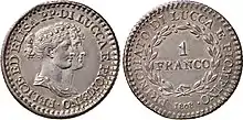 Les pièces de 1 franc 1806 et 1807 reprennent précisément les caractéristiques de ce deuxième type. Également fidèle à cette esthétique, le millésime 1808 s'en distingue seulement par une inscription de l'année nettement plus petite que pour les autres millésimes[41]. À l'avers, il se décline également en deux variantes caractérisées par la forme des bustes et l'éloignement des cheveux des souverains par rapport à la légende[41].