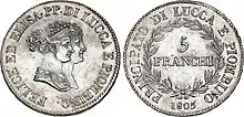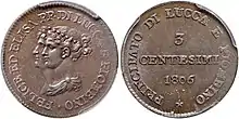 | Avers : Bustes d'Élisa et Félix tournés vers la droite, avec l'inscription FELICE ED ELISA PP•DI LUCCA E PIOMBINO. | Revers : Valeur au centre d'une couronne de laurier et de l'inscription PRINCIPATO DI LUCCA E PIOMBINO., et millésime en exergue | ||||