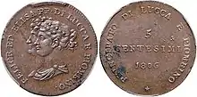 Entre 1812 et 1813, la pièce de 3 centimes est produite en grande quantité (225 000 exemplaires) du fait de sa popularité auprès des commerçants, qui l'assimilent facilement à l'ancien sou lucquois (soldo)[37]. En revanche, cette valeur déplait aux souverains qui souhaitent mettre en place un système décimal analogue à celui en vigueur en France. Le , un type esthétiquement similaire d'une valeur de 5 centimes est mis en circulation. Sa production commence en 1813 mais se limite à seulement 71 500 exemplaires, du fait de son incompatibilité avec l'ancien système duodécimal et de l'hostilité de la population à son égard. Soucieux de soigner leur popularité alors que l'Empire est confronté à des revers militaires majeurs en Europe, les souverains de Lucques annulent finalement la production de la monnaie de 5 centimes en 1814 et planifient à la place d'étendre celle des pièces de 3 centimes[38].