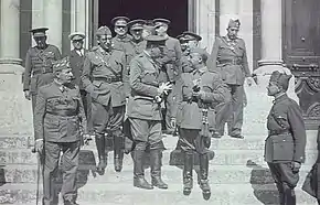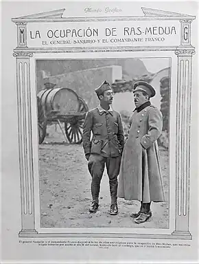 La question du Maroc avait été réglée le par la conférence internationale d’Algésiras. L’Espagne se vit attribuer le Rif, zone peuplée de tribus berbères hostiles à toute pénétration étrangère[104]. En , le sultan du Maroc accepta officiellement l’instauration d’un protectorat français sur tout le pays, et en novembre, Paris et Madrid scellèrent l’accord formel qui cédait à l’Espagne une certaine « zone d’influence », grande d’à peine 5 % du territoire, qui fut proclamée telle en , un an après l’arrivée de Franco en Afrique. En réalité, le plan s’inscrivait dans la politique coloniale française qui recherchait la collaboration de l’Espagne pour contenir les Britanniques et faire échec à toute tentative de pénétration de l’Allemagne[105],[106]. Les Espagnols avaient le sentiment de n’avoir reçu que des miettes du gâteau marocain, et l’armée espagnole, y compris Franco, en conçut une frustration certaine[107]. Franco se vit donc entraîné dans un conflit où s’entremêlaient les intérêts de l’Espagne, de la France et du Royaume-Uni, principalement, et dans lequel l’Espagne s’engagea avec témérité, sous la pression d’une part d’une armée désireuse de se dédommager des récentes défaites subies dans les colonies d’outre-mer, d’autre part d’une oligarchie financière ayant des intérêts, essentiellement miniers, dans le Maghreb[108]. Dans la Péninsule, la guerre d’Afrique eut pour effet d’élargir encore la fracture entre armée et société civile : d’un côté, devant le pacifisme croissant de l’opinion publique, beaucoup d’officiers se voyaient confirmés dans leur opinion que l’Espagne ne pouvait pas être gouvernée par des civils[109], de l’autre, l’armée était rejetée par les classes populaires, qui lui imputaient des milliers de morts, souvent des jeunes gens de familles humbles n’ayant pas été en mesure de s’acquitter de la « cote » (cuota) pour les exempter de service militaire[110].