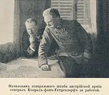 Il prépare ainsi différents projets d'action militaires, en fonction des belligérants que la double monarchie doit affronter. Si les Russes restent neutres, une attaque en masse sur le front serbe doit avoir lieu. Si les Russes entrent en guerre, il faut alors concentrer les forces sur le front oriental. À partir de 1913[31]puis en mai[32] et en [33], il tente de coordonner les plans de mobilisation et d'opérations austro-hongrois avec les plans allemands, en insistant sur les délais nécessaires au Reich pour écraser la France et concentrer ses troupes face à la Russie, son obsession durant toute la crise de juillet[34] : il rencontre ainsi à de nombreuses reprises son homologue allemand, Helmuth von Moltke, dans les années qui précèdent le conflit[35].
