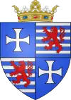 | Armoiries de Franz Joseph de Lusignan Écartelé, en 1 et 4 d'azur, à la croix d'argent (Chypre), et en 2 et 3 burelé d'argent et d'azur de dix pièces, au lion rampant de gueules, sur le écusson la couronne de marquis |
