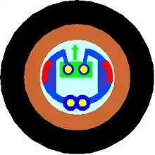 En rouge les garnitures, en jaune des pivots, en vert la came.