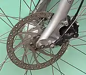 Les freins à disque consistent en un disque de métal attaché au moyeu et qui tourne avec la roue du vélo. Les étriers sont attachés au cadre ou à la fourche avec des plaquettes qui viennent frotter de chaque côté du disque. On utilise des freins à disque pour les motos depuis des décennies, et c'est le type de frein le plus répandu. Après plusieurs tentatives (partiellement réussies) au cours des dernières décennies de les introduire dans le domaine de la bicyclette, ils sont maintenant en train de se populariser. Des améliorations récentes sur le poids, le prix et la fiabilité des matériaux ont poussé plusieurs constructeurs à développer des systèmes de frein à disque qui se généralisent. On les utilise principalement pour rouler en VTT en dehors des pistes goudronnées, mais aussi parfois sur les vélos hybrides, les vélos de tourisme et depuis 2013 sur les vélos de route[1]. Certains tandems ont un frein à disque sur la roue arrière en plus de freins sur jante.
