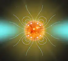 Le matériau ionisé capturé par les lignes de champ magnétique tournera avec le Soleil comme s’il s’agissait d’un corps solide. Comme la matière s’échappe du Soleil en raison du vent solaire, la matière hautement ionisée sera capturée par les lignes de champ et tournera avec la même vitesse angulaire que le Soleil, même si elle est emportée loin de la surface du Soleil, jusqu’à ce qu’elle finisse par s’échapper. Cet effet de transporter la masse loin du centre du Soleil et de la perdre, ralentit la rotation du Soleil[1]'[2].