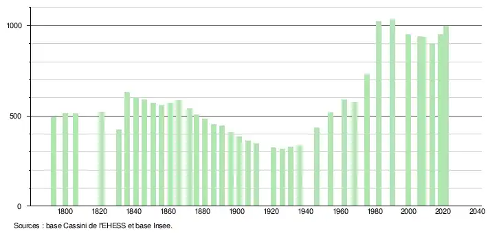 L'évolution du nombre d'habitants est connue à travers les recensements de la population effectués dans la commune depuis 1793. Pour les communes de moins de 10 000 habitants, une enquête de recensement portant sur toute la population est réalisée tous les cinq ans, les populations légales des années intermédiaires étant quant à elles estimées par interpolation ou extrapolation[21]. Pour la commune, le premier recensement exhaustif entrant dans le cadre du nouveau dispositif a été réalisé en 2008[22].