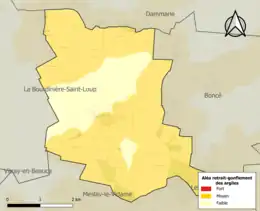 Le retrait-gonflement des sols argileux est susceptible d'engendrer des dommages importants aux bâtiments en cas d’alternance de périodes de sécheresse et de pluie. 76,6 % de la superficie communale est en aléa moyen ou fort (52,8 % au niveau départemental et 48,5 % au niveau national). Sur les 142 bâtiments dénombrés sur la commune en 2019, 123 sont en aléa moyen ou fort, soit 87 %, à comparer aux 70 % au niveau départemental et 54 % au niveau national. Une cartographie de l'exposition du territoire national au retrait gonflement des sols argileux est disponible sur le site du BRGM[18],[Carte 2].