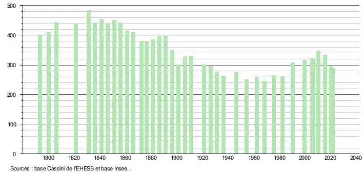 L'évolution du nombre d'habitants est connue à travers les recensements de la population effectués dans la commune depuis 1793. Pour les communes de moins de 10 000 habitants, une enquête de recensement portant sur toute la population est réalisée tous les cinq ans, les populations légales des années intermédiaires étant quant à elles estimées par interpolation ou extrapolation[23]. Pour la commune, le premier recensement exhaustif entrant dans le cadre du nouveau dispositif a été réalisé en 2005[24].