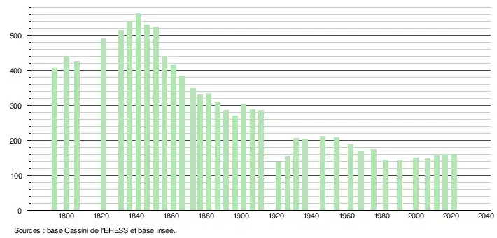 L'évolution du nombre d'habitants est connue à travers les recensements de la population effectués dans la commune depuis 1793. Pour les communes de moins de 10 000 habitants, une enquête de recensement portant sur toute la population est réalisée tous les cinq ans, les populations légales des années intermédiaires étant quant à elles estimées par interpolation ou extrapolation[23]. Pour la commune, le premier recensement exhaustif entrant dans le cadre du nouveau dispositif a été réalisé en 2006[24].