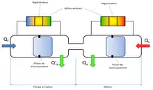Le système bielle-manivelle reliant les deux pistons est également entraîné par un moteur électrique dont le rôle est de compenser les pertes mécaniques. - Machine de Vuilleumier avec piston de puissance