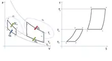 Les cycles Stirling suivis par les deux pistons qu’elle comporte peuvent être représentés dans les diagrammes P-V et T-S de la façon suivante :