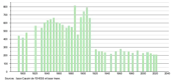 L'évolution du nombre d'habitants est connue à travers les recensements de la population effectués dans la commune depuis 1793. Pour les communes de moins de 10 000 habitants, une enquête de recensement portant sur toute la population est réalisée tous les cinq ans, les populations légales des années intermédiaires étant quant à elles estimées par interpolation ou extrapolation[16]. Pour la commune, le premier recensement exhaustif entrant dans le cadre du nouveau dispositif a été réalisé en 2007[17].