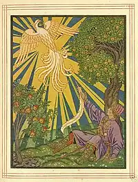 - Ce début est précisément celui du conte célèbre de L'Oiseau de feu (Conte d'Ivan-tsarévitch, de l'oiseau de feu et du loup gris), sauf qu'Ivan capture ici l'oiseau au lieu de ne lui arracher qu'une plume.
