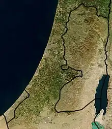 Image satellite du Levant prise par le satellite Terra, en 2010. Les frontières entre Israël et la Palestine sont représentées par un trait noir.
