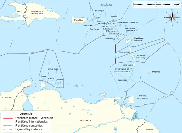 La frontière entre la France et le Venezuela consiste en deux segments maritimes, à l'ouest des îles françaises de Guadeloupe et de Martinique et à l'est de l'île vénézuélienne Isla de Aves.