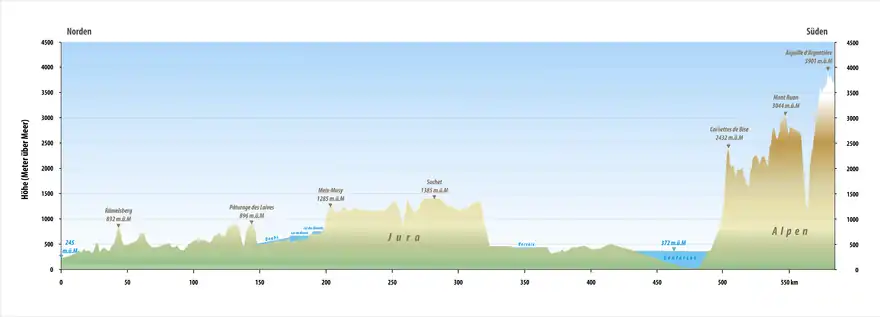 La frontière suit ensuite une direction générale vers le sud-ouest à travers le massif du Jura, jusqu'aux environs de Genève. Entre Meyrin et Saint-Genis-Pouilly la frontière passe à travers les bâtiments et installations de l'Organisation européenne pour la recherche nucléaire (CERN), dont le tunnel du Grand collisionneur de hadrons (LHC). Elle contourne alors Genève en passant le Rhône avant de rejoindre la rive sud du Léman entre Chens-sur-Léman (France) et Hermance (Suisse). La frontière passe alors au milieu du lac pendant une cinquantaine de kilomètres[3], avant de rejoindre à nouveau la rive sud en coupant le village de Saint-Gingolph. Elle prend alors une direction générale vers le sud à travers les Alpes.