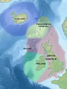 Carte de la zone économique exclusive islandaise portée à 200 nm (bleu foncé) et tronquée au nord-ouest par la zone économique exclusive du Groenland et au sud-est par la zone économique exclusive des îles Féroé. | |