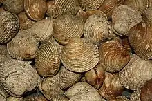 | Clam Autres noms : quahog, praire plate, palourde plate Famille : Veneridae Espèces consommées : Mercenaria campechiensis, M. mercenaria, Meretrix lyrata, M. meretrix | Les clams ont été introduits en France par les Américains en 1917. Ils se récoltent à l'embouchure des fleuves sur des fonds sableux et vaseux (côte est des États-Unis et du Canada, Charente). Les clams se mangent crus ou préparés comme les huîtres. Leur chair est rosée et assez ferme[27]. | ![]() Mercenaria mercenaria |