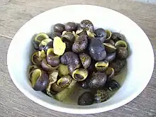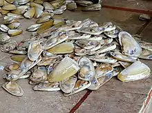 | Pholade Autres noms : dail, gîte Famille : Pholadidae Espèces consommées : Cyrtopleura costata, Pholas dactylus, P. orientalis[13] | ![]() Pholas dactylus | |