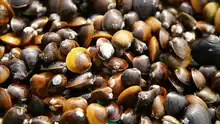 | Corbicule Autres noms : petite corbeille, palourde asiatique Famille : Cyrenidae Espèces consommées : Corbicula fluminea, C. japonica, C. leana, Geloina bengalensis, G. expansa, Polymesoda arctata, P. caroliniana, P. triangula | Corbicula fluminea est consommé en Corée et en Chine (où l'on trouve des sous-populations triploïdes et tétraploïdes correspondant à des formes à corbicules à coquilles jaunes et brunes[30], mais peut bioaccumuler des polluants dans les cours d'eau ou sédiments pollués (HAP notamment[31]). | ![]() Corbicula leana |