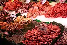 | Concombre de mer, bêche de mer, espardenya (Catalogne), vier marin (Côte marseillaise), trépang (malais), namako (Japonais) | La pêche commerciale des holothuries semble s'être développée il y a environ 1000 ans en Chine[50]. Diverses espèces d’holothuries, vidées, bouillies, séchées et fumées sont consommées en Chine et à Singapour sous le nom de trépang et y sont très appréciées[51]. On en consomme également au Japon sous le nom de namako. De l’Océan Indien au Pacifique en passant par l'Indonésie (Makassar), les concombres de mer sont récoltés pour prélever leurs téguments, sur un mode principalement artisanal mais localement relativement intensif. Sur place, on les mange bouillis, séchés, marinés, en potage ou encore frits : la technique du séchage est la plus appropriée à l'exportation vers l'Asie du Sud-Est, qui demeure la principale raison de cette pêche dans les pays insulaires. Quelques espèces peuvent être consommées crues (Apostichopus japonicus, Cucumaria frondosa, Parastichopus californicus)[50]. En France, la principale holothurie consommée traditionnellement est l'« Espardenya » (Parastichopus regalis), notamment dans le sud-ouest ; c'est un mets de choix en cuisine catalane, mais son commerce est très peu développé. Pour nettoyer les espardenyes, il faut couper les deux bouts, les ouvrir par la moitié et les rincer à l'eau pour éliminer le sable. Elles s'utilisent entières ou coupées en bandes. D'habitude, on les mange presque crues, à la plancha, cuites pendant quelques secondes d'un seul côté ou en bouillon, cuites pendant pas plus de dix minutes. Elles s'utilisent dans la cuisine traditionnelle catalane, notamment comme ingrédient ou accompagnement des typiques plats mariniers catalans à base de riz safrané du même genre que, par exemple, la paella ou avec des légumes secs. Certaines recettes le cuisinent avec des pieds de veau cuits avec une base de Sofregit, des haricots blancs avec safran et pignons de pin ou avec des lamelles de champignon. De nos jours, les espardenyes se mangent aussi comme tapa. | ![]() ![]() |