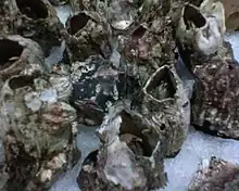 | Huître de roche Autres noms : huître de palétuvier, huître tropicale, huître de mangrove Famille : Ostreidae Espèces consommées : Saccostrea cucullata[16], S. glomerata, S. scyphophilla | Dans les pays tropicaux de l'Indo-Pacifique on trouve parfois en abondance la petite huître tropicale Saccostrea cucullata, qui est comestible et consommée localement. Son élevage demeure très limité, et elle n'est pas exportée[17]. | ![]() Saccostrea cucullata |