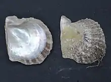 | Huître perlière Autres noms : méléagrine, pintadine, mère-perle, akoya Famille : Pteriidae Espèces consommées : Isognomon ephippium, Pinctada fucata, P. imbricata, P. radiata | Elles sont également pêchées pour leur chair comestible et leur coque brillante. | ![]() Pinctada radiata |
